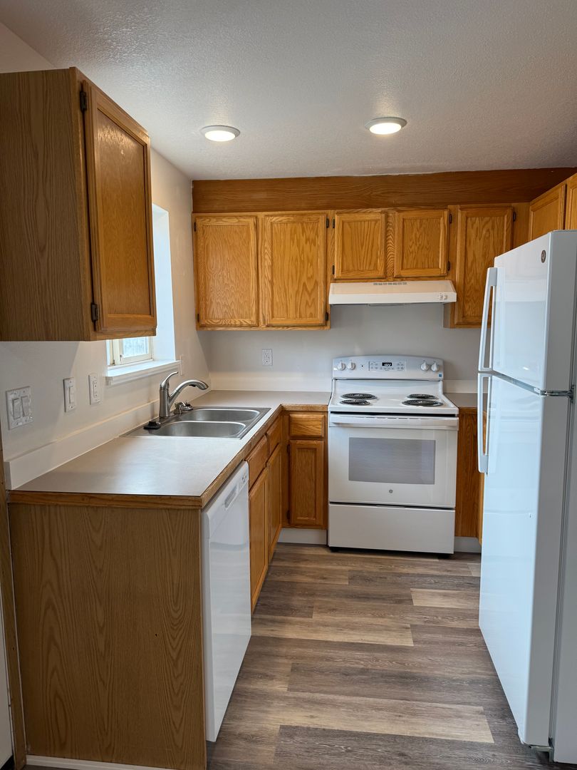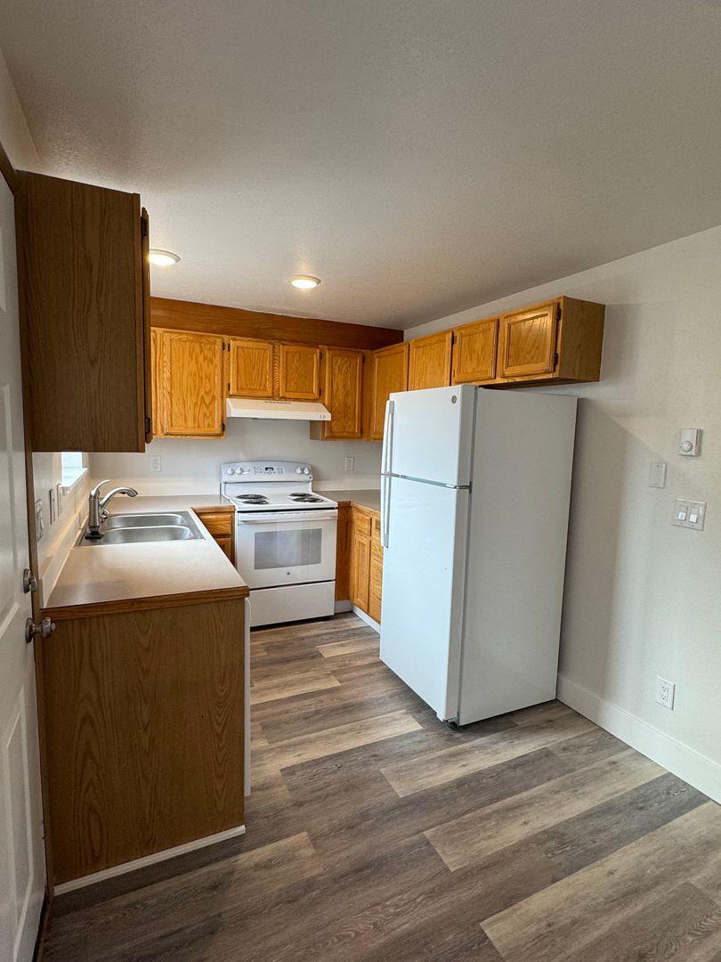 Updated apartment in SW Redmond. All new paint, flooring and appliances. Townhouse style with bedrooms up stairs and living area down. Open floor plan with LVP thought out bottom floor. Fenced on patio area. Coin-up laundry and small storage unit. Call for a showing today.